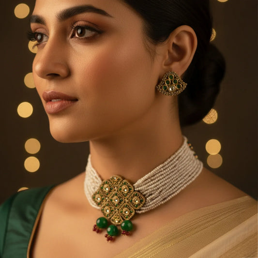 Antique Polki Green Stone Pearl Choker Set